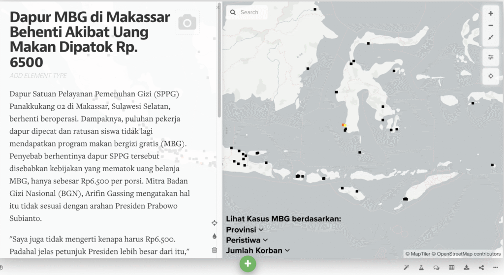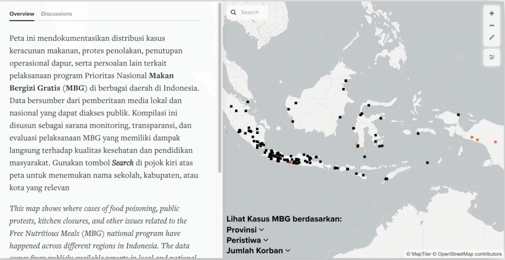 The MBG Monitoring Map is an interactive database designed to track and visualize various incidents related to the implementation of Indonesia’s Free Nutritious Meal Program (Makan Bergizi Gratis / MBG). It compiles publicly accessible reports from national and local media, documenting cases such as food poisoning, protests, supply delays, and operational shutdowns of school kitchens across different provinces. By consolidating this information into one accessible platform, the map provides a transparent, real-time overview of how the program is being carried out nationwide.